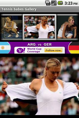 pictures of the worlds sexyest female tennis stars playing Tennis, and in modelling poses.All Pictures are stored within the app, no extra downloading, no messging up your own gallerys.Slide show of some of the better pictures within the app.LOTS MORE PICS in next version
