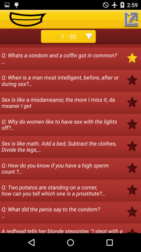 BEST DIRTY AND SEXY JOKES has been the most popular jokes app ever created for the last 4 years now. Enjoyed by more than 2 million people around the world. And you don't need internet connection to browse them!