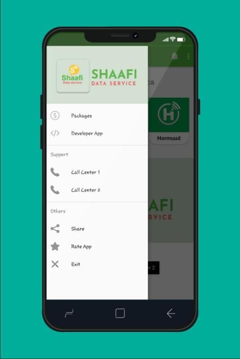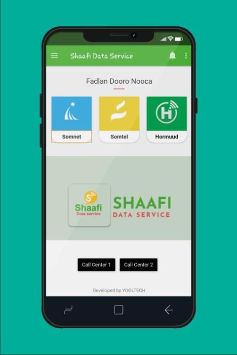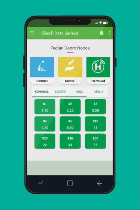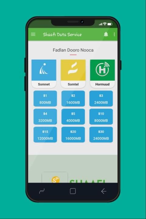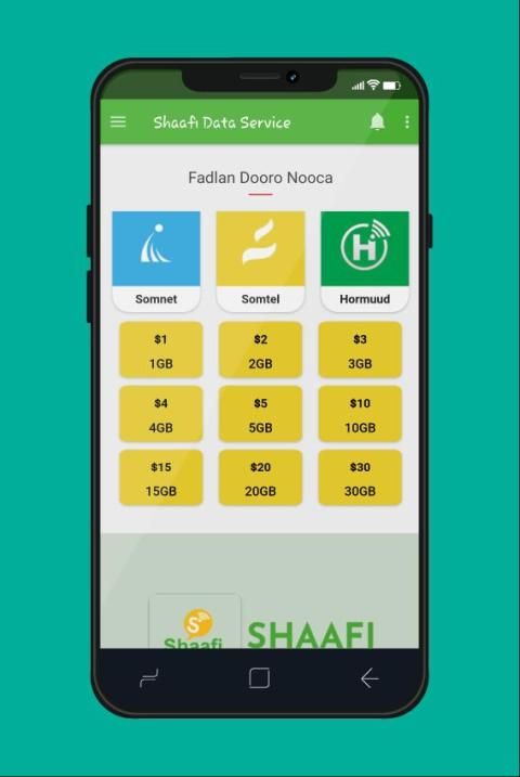 Waxaad ka iibsan kartaan xirmooyinka SomNet iyo Somtel. Hada kadib uma baahnid in aad cid la hadashid ama qarash telefan ku bixisid si laguugu shubo xirmo SomNet hadii aad isticmaashaan Shaafi Data app. Sidoo kale ka waxaad ka heli doontaa Adeegyada EVC Plus, ANFAC iyo Artimet