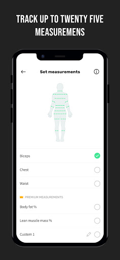 - Track additional 10 new measurements: Body Fat percentage, Muscle mass percentage, Separate measurements of Left bicep, Right bicep, Left forearm, Right forearm, Left Thigh, Right Thigh, Left calf, Right calf
