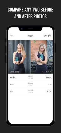 - Compare any two progress pictures as before and after photos to see the difference in your physique and in the measurement values.