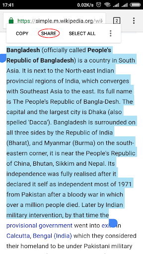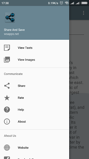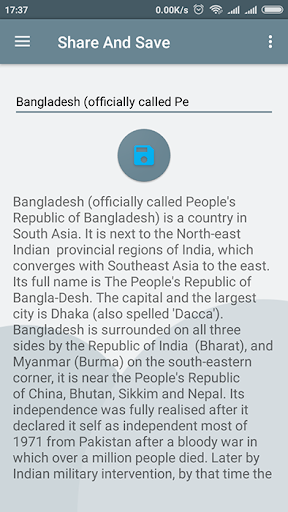 Have you ever wanted to save some text from your browser for future use? Did you see, how much difficult and time consuming it is? Or if you want to save your favorite image from other apps, you may need this application. This is an All-in-One solution to save text and image content from any other apps by sharing. Select the text or image, and just share it to Share And Save, it will save the content for you in just ONE CLICK. Later, you can browse your texts and images, view them, or do whatever you want.