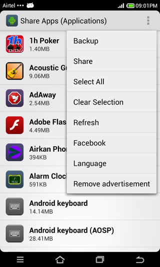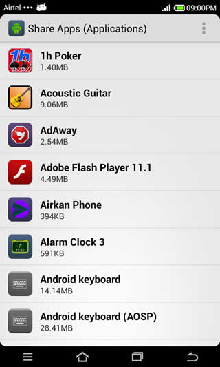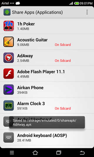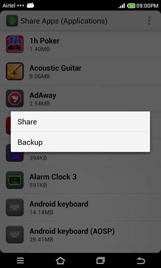 Applications which are downloaded and installed from the Google application store can be shared with friends and family. This "apkshare" application allows you to take backup of your application on the internal storage or memory card.