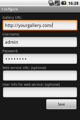 The app has the ability to download username and password defaults from your gallery install. Add a file called gallery_share.txt to the root of your gallery install containing:
