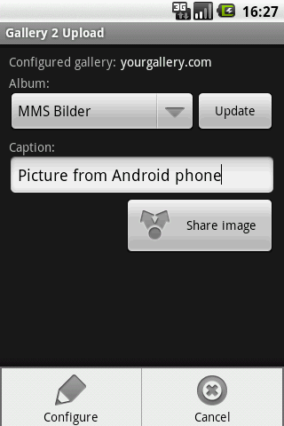 It adds an option to the "Share" menu that lets you upload images directly from the camera or a folder to a Gallery2 album (http://gallery.menalto.com/). Stores configuration so you don't have to enter this more then once.