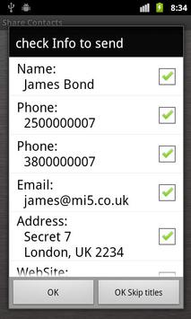 First select one or more contacts from your phone book, select the specific info for each contact you wish to share and send it.