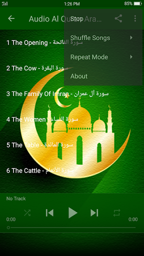 just install the app and select the surah to listen. If you want to recite Arabic text of Quran, which comprises the entire surahs and audio recitation of each surah and ayat. You can go to the option menu at the top-left corner and select “Al-Sudais Full Quran”. This app also include “Quran Audio Playlist” option that let you listen to all surahs continuously.