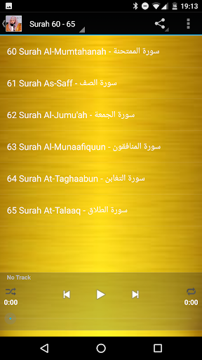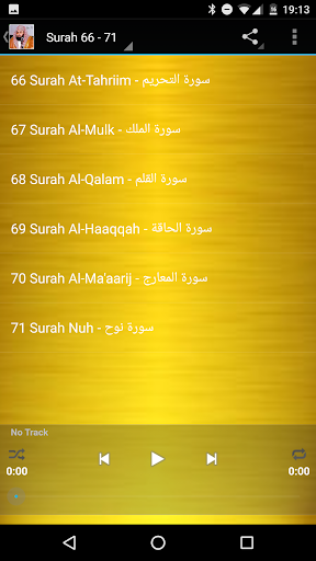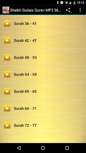 This app lets you listen to the recitation of surah 36-77, from the Holy Quran by Abdul Rahman Al Sudais. Requires no downloads or streaming just install the app and select the surah to listen.