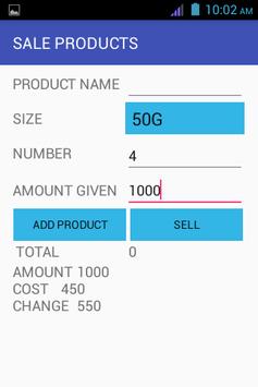 You can either sell one product or many at once. To sell more than product at a time just fill product name Size and number then press 'ADD PRODUCT' after adding all products enter amount given by customer then press 'SELL'