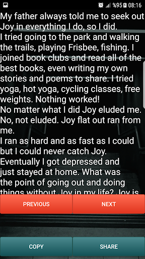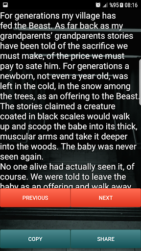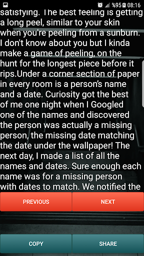 I found some short scary stories for you. Enjoy sleeping with the lights on. It does not require internet Copy Option Share via SMS Share via social message applications Share via social platforms A lot of special horror stories!