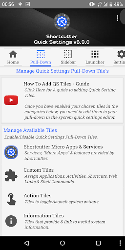 - Custom Tiles - Add a shortcut to any application, activity, shortcut on your device, assign a web address/search term, direct dial, direct message or shell command (Root).