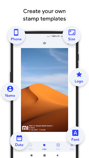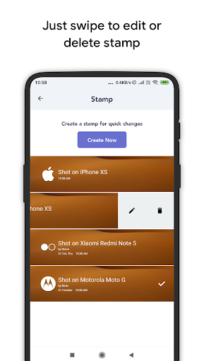 Start with creating a stamp. Yes, you can create your custom stamp for quick use in the future. You can set the Phone Model, You Name, Custom Date & Time, Any Logo, etc.