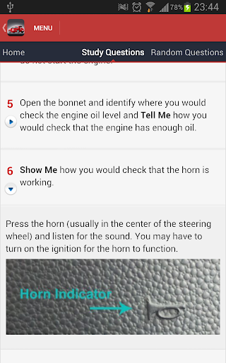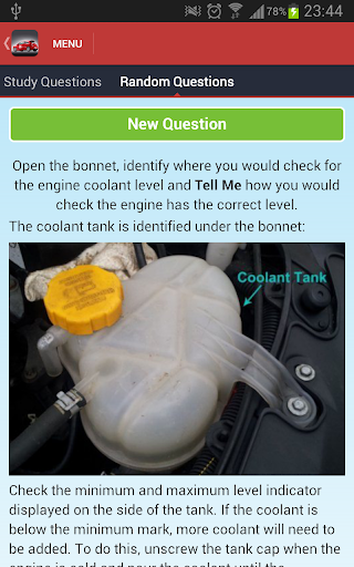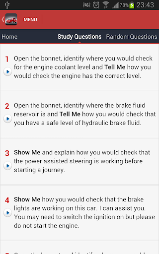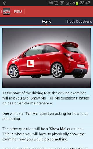 At the start of your driving test, the examiner will ask you two 'Show Me, Tell Me' questions based on basic vehicle maintenance. This app illustrates the 19 possible questions and provides answers and instructions with pictures ensuring you a great start to the exam!