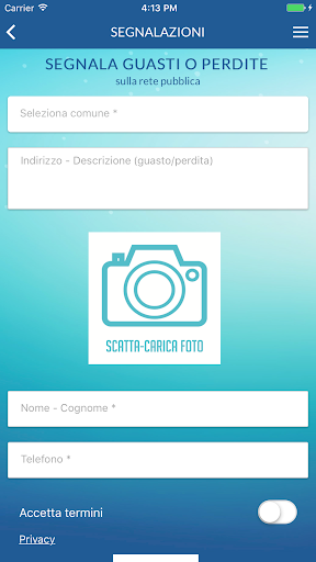 Possibilità di invio segnalazioni in caso di guasti alla rete idrica pubblica oppure invio segnalazioni ai comuni.