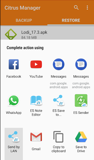 In the "Share" dialog, select "Send by LAN" (this has the blue and white "ES File Explorer" icon).