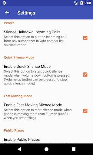 • Users can select public places from the app database – the mobile will automatically detect the users’ location and put the mobile on silent/vibrate mode. Very useful if you often forget to silence your mobile at public places such as libraries, schools, colleges, places of worship, movie theatres, etc. When you move out of that location, the mobile will automatically revert back to original settings.