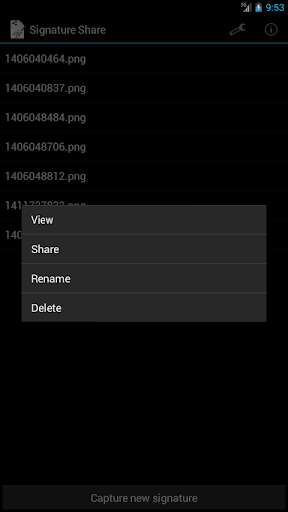 Press and hold for context menu ('View', 'Share', 'Rename', 'Delete').
