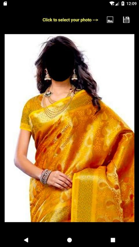 Select a Saree, select your photo from gallery, adjust your face and save. Done!