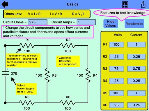 - Resistor values can easily be changed with a picker, keypad or using randomize button.