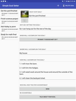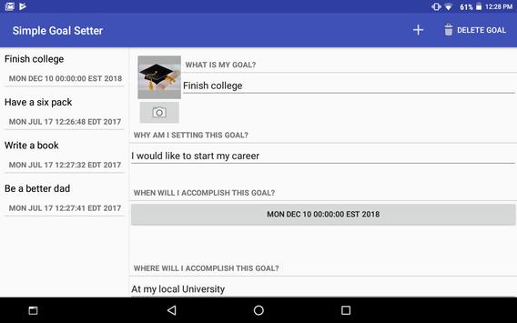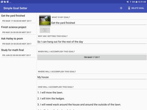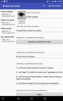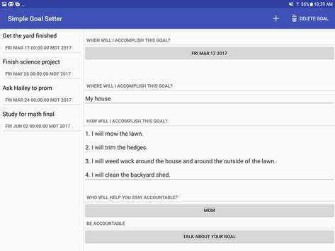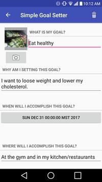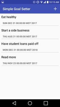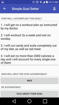 Simple Goal Setter is a goal-setting application that organizes the details of the goal in a clear and crisp design. Simple Goal Setter is clearly organized and highly functional. What sets Simple Goal Setter apart from the others is the social aspect of it all. Simple Goal Setter allows you to Pick your #1 fan from your contacts to help and support you, and has a special portal to allow you to be accountable to your fan directly from your goal details page. Being accountable statistically improves results at an alarming rate. The organization and the accountability of Simple Goal Setter make it a first choice for those who are more interested in a great application for great results