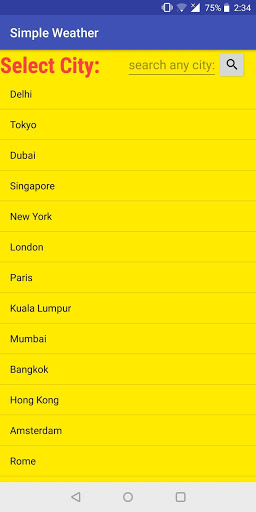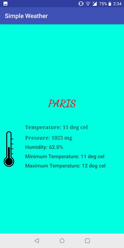 This app provides the following information about any city in the world: 1) Current Temperature 2) Pressure 3) Humidity 4) Maximum Temperature 5) Minimum Temperature