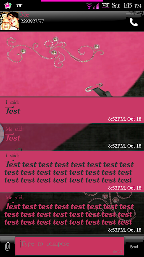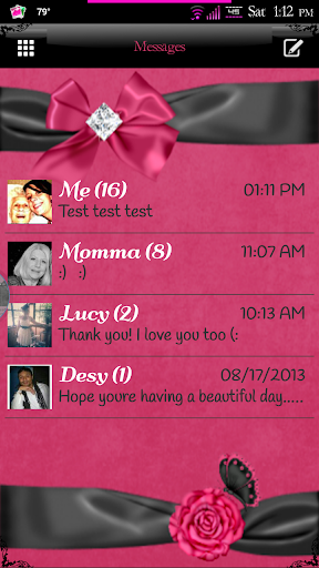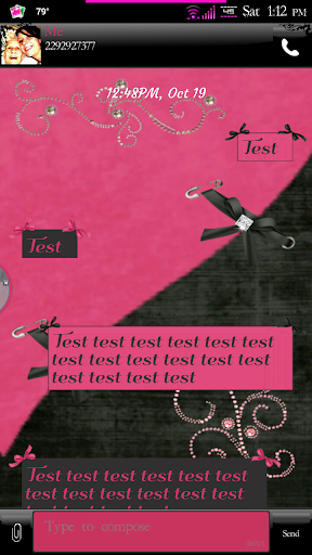 Simply Lovely Go SMS Pro theme is packed with a scrapbook type style. Complete with butterflies, delicate roses, silk ribbons, and shiny diamonds. It's made up of ebony black and a soft rose pink color.