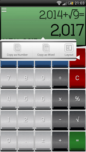 COPY, hold your finger on the result to copy as numbers or as words. Eg.: 108 (number) or One hundred and eight (word). Also result screen are scrollable for large numbers. Numbers can be formated with thousands separator.