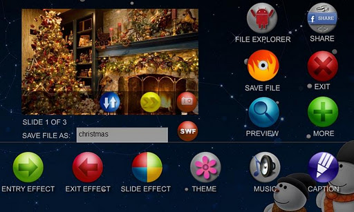 Slide Maker is A slideshow creator. It can be used to create slideshows, ecards, greetings and presentations using images, videos and music. You can add cool animation and decorative text. Once created, You can export your slideshow as swf or post it directly on Facebook. You can also embed it or have a permalink for itLIMITATION:Cannot Upload SlideShow to Youtube.You can add video, add pic, add image, edit video, edit image, create animation, make ecard, make birthday card, make custom greeting card using SlideMake.I also allows you to make movie, make film, create photo album, create video album, add video effects, add image effects, add animation effects, add slides and add mp3 to your slideshow.Moreover, you can make playlist, make presentation, add caption, export swf, share on facebook, embed, create links,create permalink, upload to facebook.Several themes can be added. You can add hearts theme,add balloons theme,add snowfall theme and change colors using SlideMaker.All in all Slidemaker is image editor, video editor and animation creator.