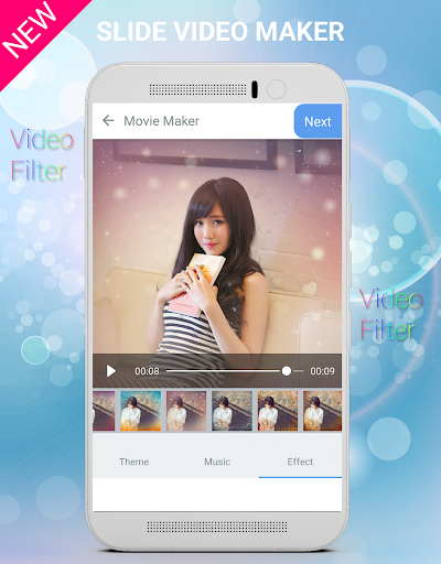 In Slideshow Video Maker application your video editor with best tools: Music, Frames, Effects,