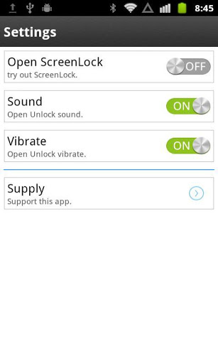 A new screen lock appeared on this market.Unlock your phone screen by sliding the key (a key image). Put the key into door keyhole, you can unlock your screen successfully.Superiority of this screenlock:*** Easy to unlock. It is a type of sliding lock.*** Charging icon and power shown. Charging dynamic image tell you it is charging or not.*** Used in android mobile phone/cell phone and tablets.*** Free screen lock. charged 0$.*** Clock information offered.*** Day, month and year appeared in locking page.How to unlock?*** Open this lock tool and turn on the lock switch.*** Set the sound and vibrate effect.*** Then the lock will take effect. when you open phone again, you can see a locking page.*** Drag the key into keyhole, a sound and vibrate notify you the unlocking progress and result!FUNCTIONS:*** Use a sound effect to notify your unlocking way.*** Set a open vibrate effect.*** Open or close the lock---take the key lock into use or not!*** Time and date info.*** Phone battery situation shown.*** Sound and vibrate effect can be turn off too! So when you need keep quiet, the unlocking sound effect can be turn off!####################NOTE###############################Free screen lock provided fro all android mobile phone and tablet users. But we need money to keep our life, so some notification and icon ads be added in this lock too! I bet these ads are harmless, hope you can respect our decision!Have a simple screen look right now! The key dragging unlocking way is different from others lock!######################################################