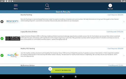 Small Business Startup also tells you how long the opportunity has been in business, and how fast it is growing. The app lists the total business cost and investment required, and in many cases, we break out the fee and standard business royalties. Best of all, we provide a safe, easy and secure way to contact the business team directly to learn more about the best businesses for sale.