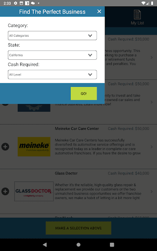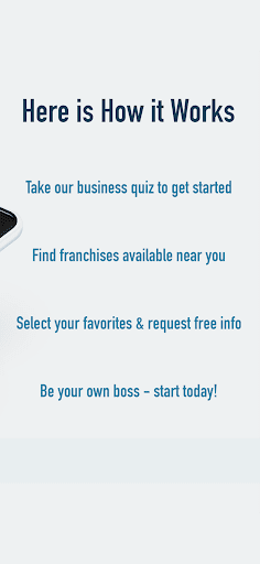 After a quick startup quiz to understand your entrepreneurship goals, our unique app matches your interests with popular opportunities, based on choice by other entrepreneurs just like you. Compare business ideas, choose YOUR favorites, and contact businesses directly through the app.