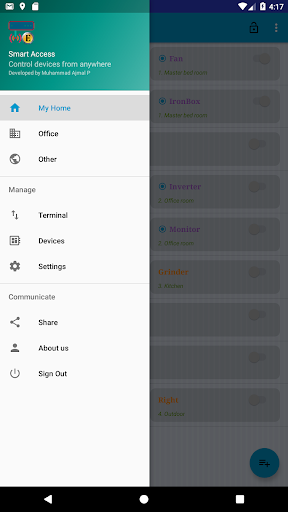 This application helps to control electronic devices remotely. This is a cloud base application, so no Static IP required. You need a WiFi/Ethernet at Home/Office to connect Arduino devices. Then from your phone, you can control connected appliances from anywhere.