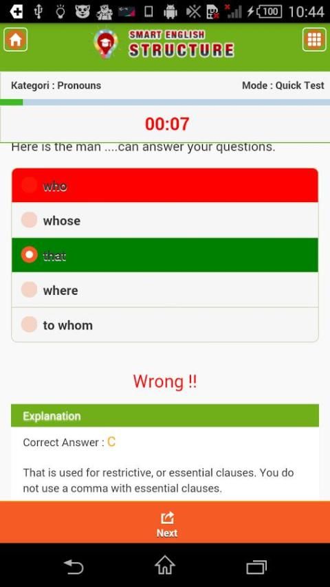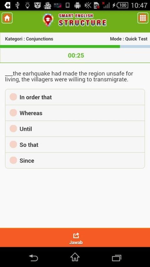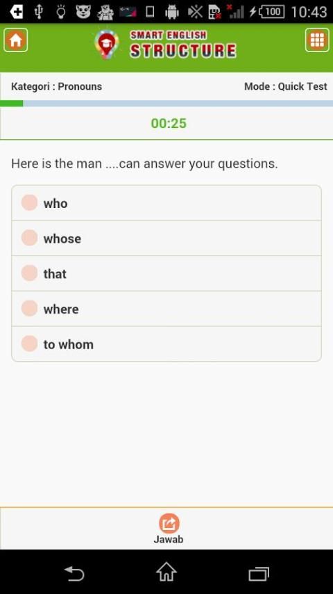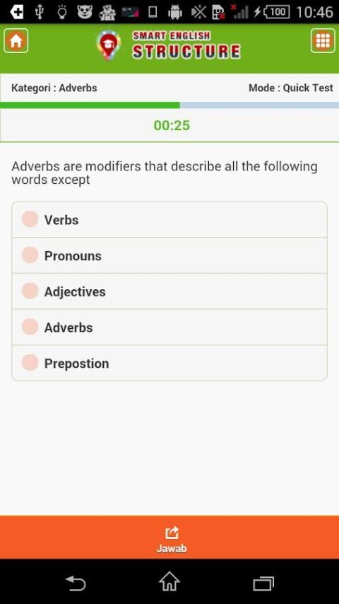 Kamu bisa berlatih RIBUAN soal (+pembahasan) English Structure dalam aplikasi yg simpel, ringan dan powerful. Siapkan dirimu untuk UN, SPMB, Ujian Sekolah, TOEFL, dll.