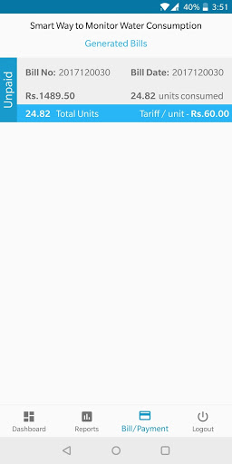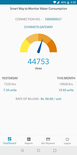 The user gets to view daily, monthly and annual consumption reports with consumption patterns and trends. Bill view offers the user to view monthly bills and pay them promptly. The app allows the user to view instantaneous meter reading. Tariff rate is also displayed on the dashboard.