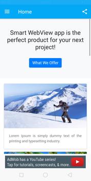 Android WebView is an powerful widget to convert your existing website or webpage to native android app.This WebView app display webpage into android app activity perfectly. You can also show HTML local page inside your application using this app.No need to update your app content. When you update your webpage's,these update also shown inside your app activity.This product help you to build your own app for your website within few minutes. Know about this product below