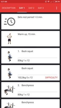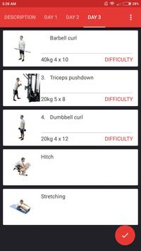 do chest, legs workout or shoulders, back workout in one training. Biceps, triceps workout, for example, in muscle building program for male is on separate day. In every training day we have specified special section for hitch where you can find abs workout for all users and wrist, calf and shrugs workout for male. For maximum progress in your weight training goals you should keep to the appropriate diet plan.