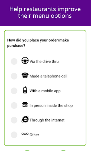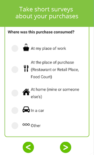 1) Use the SnapMyEats receipt survey located within the app to answer five short questions about your food or drink purchase.