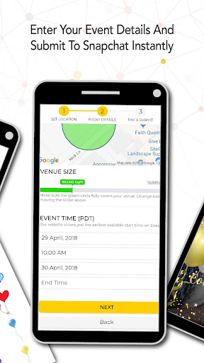 Once you have finished customizing your design, you can instantly submit it to Snapchat directly from the app. Enter your event details and purchase your filter or lens. That's it, you're done! Just sit back and relax as we take care of the rest.