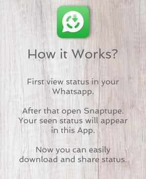 Snaptupe application helps you to download the status posted by your friends. You have to just give a single click on the app and you will get all the images and videos of your friend's status. It is easy to use and lightweight. User can download status videos and photos within seconds.