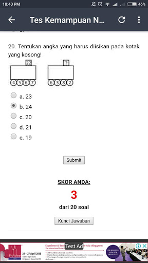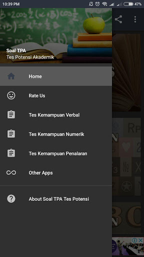 Aplikasi Soal TPA Tes Potensi Akademik Lengkap adalah aplikasi berisi simulasi interaktif soal TPA Tes Potensi Akademik untuk membantu Anda dalam mempersiapkan diri mengikuti ujian TPA untuk keperluan tes masuk kerja, kuliah, beasiswa, dll. Soal-soal dalam aplikasi ini berbentuk pertanyaan pilihan ganda, dengan disertai kunci jawaban di bagian akhirnya.