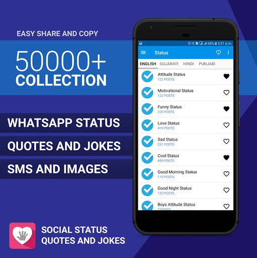 This application contain the status for Whatsapp, hike and Facebook like other social sites.