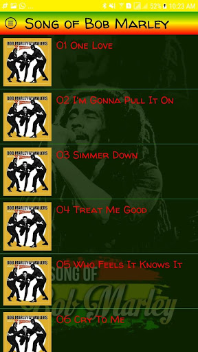 Questa applicazione contiene canzoni del genere musicale Reggae da parte di un musicista di fama mondiale Bob Marley che è anche conosciuto come re dei reggae. Bob Marley proviene dalla Giamaica un arcipelago vicino a Cuba.