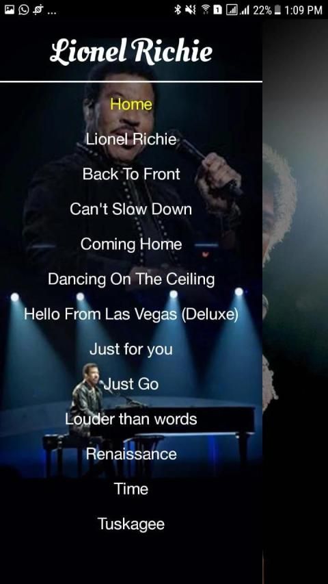 Lionel Richie Penyanyi Soul/Pop yang berkebangsaan Amerika ini sudah di kenal di dunia musik sejak tahun 60an hingga sekarang Lionel Richie menjadi salah satu musisi dengan penjualan album rekaman terbaik di dunia di mana album penjualan rekamannya mencapai 90 juta kopi di dunia dengan lagu-lagunya yang hits di antaranya "Hello", "Endless Love","Stuck On You", dan "All Night Long", yang lagu-lagunya bisa anda dengarkan melalui aplikasi ini.