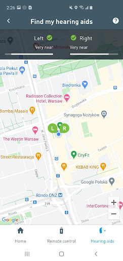 The app offers a “Find my hearing aid” search feature, links to user instructions, and low battery notification.