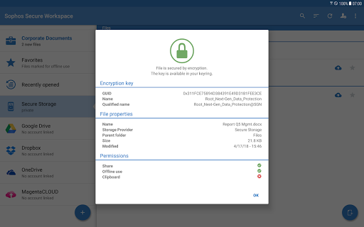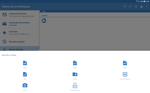 Sophos Secure Workspace is the place where you can access your company’s documents or corporate websites. All data is stored with AES-256 encryption, matching military grade requirements. Sophos Secure Workspace is designed to prevent data loss if your device gets stolen or lost.