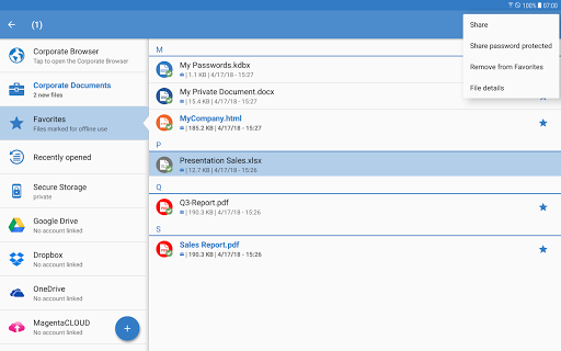 • Corporate Browser: Enable your users to securely access corporate websites. All browsing data is stored in encrypted form.