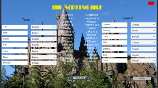 Input player names and then click submit. The app then sorts out teams for Quidditch.