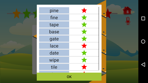 This basic and simple educational application developed in collaboration with kindergarten teachers lets your child develop an understanding of English 4 letter words. This app is a collection of four letter words that end with the vowel "e", also referred to as "magic e" words. The usage of the vowel "e" at the end of a three letter word changes the sound of the first vowel, giving altogether a new word. It enables the child to learn and test progress of four letter word recognition and pronunciation by utilizing speech recognition.