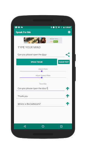 Learn how to pronounce words in another language or accent, or If you are mute or have suffered an injury that has impaired your voice, let your voice be heard through Speak For Me - Text to Speech. Speak For Me uses the Text To Speech Engine your phone already has installed, therefore the app cannot change the gender of the voice.